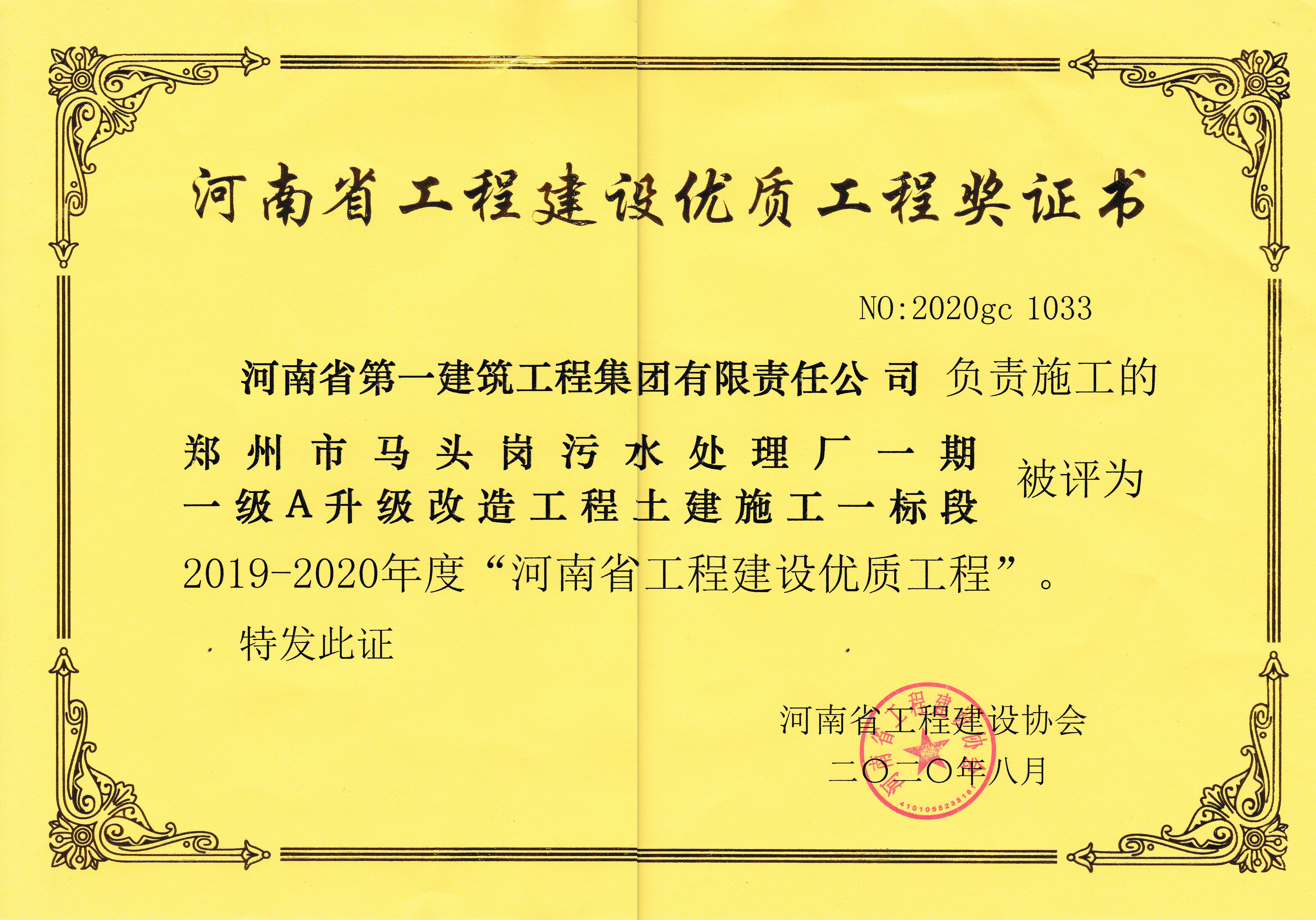 郑州市马头岗污水处理厂一期一级升级A改造工程土建施工一标段(河南省工程建设优质工程)