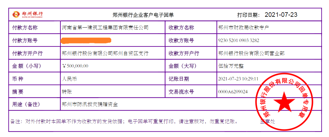 公司向郑州市防汛抗旱指挥部捐赠50万元用于抗洪救灾