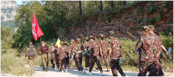 第三天的定向穿越环节,训练营在清峰关出发,沿着山路和步道登上老爷顶再返回,山高路陡,滚石林立,大家互相鼓励支持,最后都成功登上山顶,让河南一建第九分公司的营旗在老爷顶上空迎风招展。