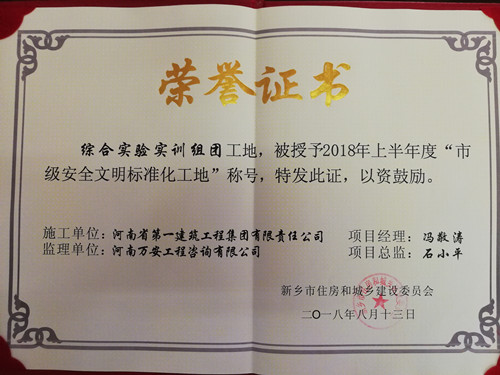 第十项目部河南师范大学综合实验实训组团工地荣获新乡市安全文明标准化工地称号
