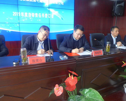 4月2日上午,七公司举行2019年度目标责任书签订仪式,七公司董事长张青山与总经理郭建勇,总经理郭建勇与分公司(项目部)经理、分公司(项目部)经理与工程项目经理分别签订了责任书。七公司董事长张青山要求各单位一定要认清形势,进一步增强使命感和责任感,严格执行分解后的任务目标,实现 “千斤重担大家挑,人人头上有指标”,大家要真正把指标作为工作目标、把压力作为工作动力、把责任作为工作使命,敢于担当、有所作为,确保完成年度各项工作目标任务。(汤青松)