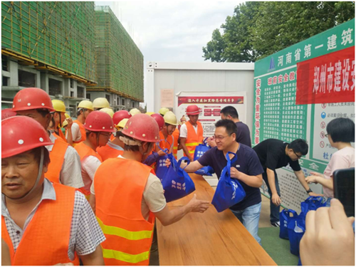 5月24日,郑州市建设安全监督站郑州经济技术开发区分站站长张秋福带队巡检科、综合科、督查科人员来到郑州市森林公园拆迁安置项目工地进行宣传“打黑除恶”并向现场一线工人发放慰问品。(张田四)