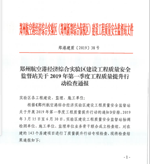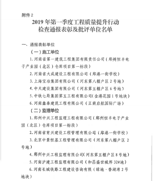 7月30日,郑州市航空港区建设工程质量安全监督站发文通报了2019年第一季度工程质量提升行动检查情况,由集团公司第十九项目部承建的郑州恒丰电子产业园(北区)仓库第一标段等六个工程项目受到了通报表扬。(王淑勤)