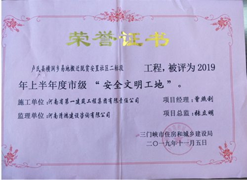 近日,集团公司二分公司承建的卢氏县横涧乡易地搬迁脱贫安置社区二标段工程被三门峡市住房和城乡建设局评为2019年上半年度市级“安全文明工地”荣誉称号。(高培)