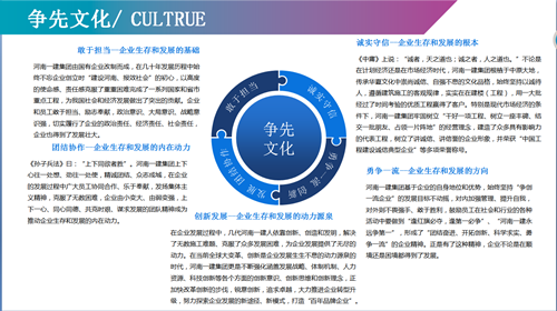 一是分公司组织人员统一制作了图文并茂集团公司企业文化体系PPT,发给各个项目部,各项目则月例会的形式开展宣贯学习,确保做到全员发动、全面融合和全力落实,在项目上下掀起宣贯企业文化理念的热潮。
