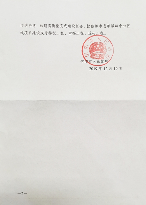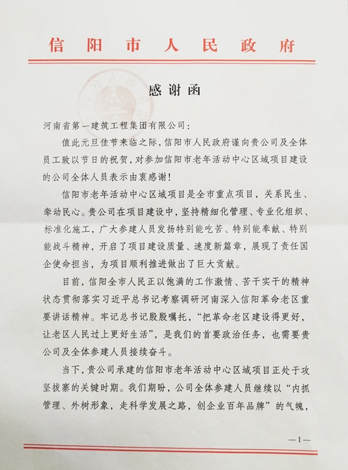 近日,集团公司收到了来自信阳市人们政府的感谢函,感谢集团公司在信阳市老年活动中心区域项目建设中为项目顺利推进做出的贡献。感谢函指出“贵公司在项目建设中,坚持精细管理、专业化组织、标准化施工,广大参建人员发扬特别能吃苦、特别能战斗精神,开启了项目建设质量、速度新篇章”,并期盼把信阳市老年活动中心区域项目建设成为样板工程、幸福工程、联心工程。