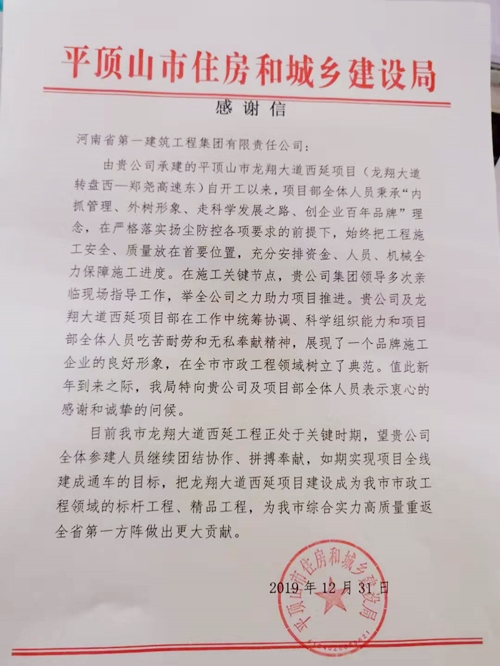 2019年年末,集团公司收到了平顶山市住房和城乡建设局的感谢信,对集团公司承建该市的重点工程——龙翔大道西延工程的进度和质量表示肯定,赞扬集团公司及龙翔大道西延项目部“在工作中统筹协调、科学组织能力和项目部全体人员吃苦耐劳和无私奉献精神,展示了一个品牌施工企业的良好形象,在全市市政工程领域树立了典范”。