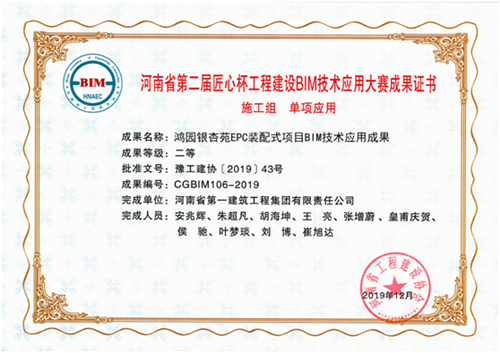 由河南省工程建设协会主办的河南省第二届“匠心杯”工程建设BIM技术应用大赛成果颁布会于2020年1月4日在河南财经政法大学圆满结束,我公司参赛的作品获得两项二等奖、三项三等奖和五项优秀奖的优异成绩,其中第四项目经理部的“鸿园银杏苑EPC装配式项目BIM应用成果”和第十项目经理部“河南师范大学综合实验实训组团BIM技术应用”荣获施工组单项BIM应用二等奖。