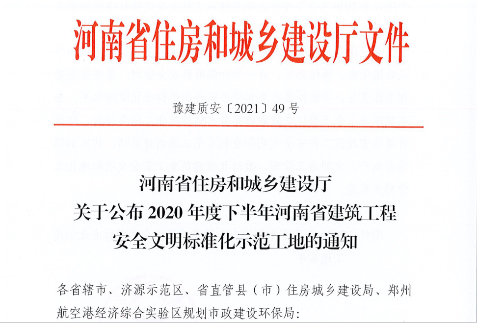 按照《河南省建筑工程安全文明标准化示范工地管理办法》(豫建质安〔2020〕93号)和《关于开展2020年下半年河南省建筑工程安全文明标准化示范工地认定的通知》(豫建质安〔2020〕442号)文件要求,经各地建设主管部门审查推荐,省住建厅组织评审后,下发了《河南省住房和城乡建设厅关于公布2020年度下半年河南省建筑工程安全文明标准化示范工地的通知》(豫建质安〔2021〕49号),我公司共有四项工程获奖,获奖名单如下: