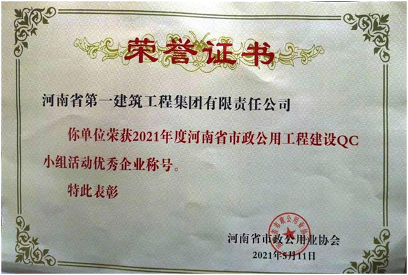 集团公司获2021年度河南省市政公用工程建设 QC小组活动优秀企业称号