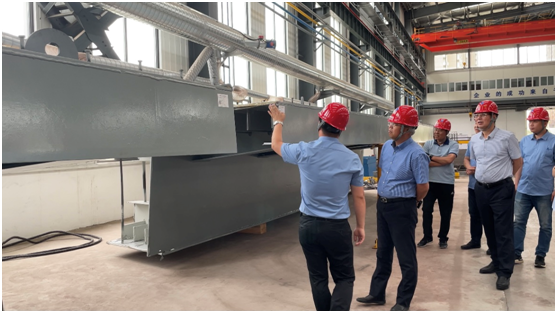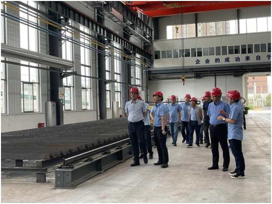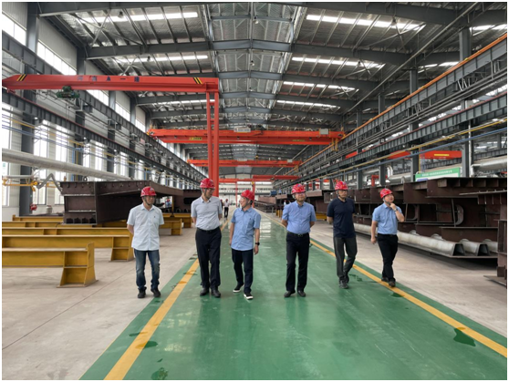 刘定国总经理一行在6#生产车间先后参观了单元件组焊区、钢箱梁组装区、待抛区、喷砂室、烘喷两用室、反变形胎架焊接区、矫正区、成品堆放区等,深入了解了生产工艺、生产流程、生产设备等车间建设情况。