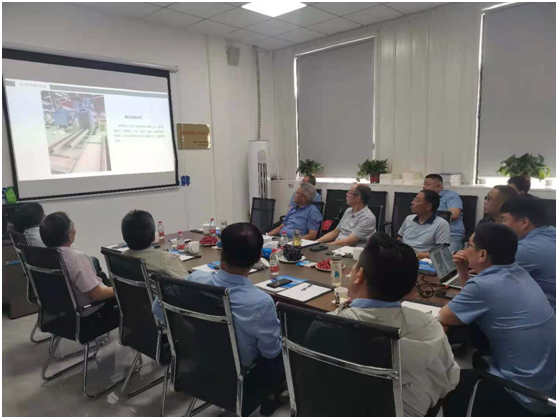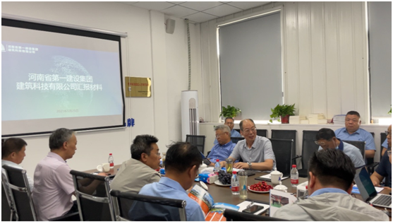 在园区接待室,集团公司总经理班子成员听取了集团公司装配事业部副经理兼建筑科技有限公司生产安全副经理王晖关于科技公司基本情况、组织架构、生产经营、质量安全管理、企业文化宣传建设及技术团队培养、未来发展规划等六个方面的汇报。