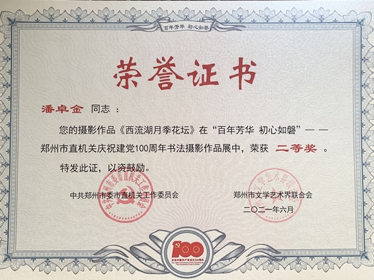 在市委市直机关工委和市文联举办的“百年芳华 初心如磐”郑州市直机关庆祝建党100周年书法摄影作品展览活动中,集团公司员工潘卓金的摄影作品《西流湖月季花坛》荣获二等奖。