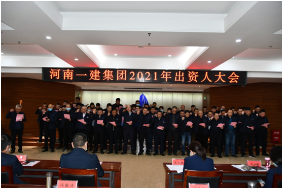 新当选的59名出资人代表在主席台前,在杜少华的领誓下,面对出资人举起右手宣誓:忠于集团公司,认真履行代表的义务和职责,践行“精诚、担当、鼎新、卓越”核心价值观,发扬“团结奋进、开拓创新、科学求实、勇争一流”的企业精神,遵守“忠诚敬业、技能精专、团队协作、创新学习、奉献社会”的行为准则,为实现“打造建筑企业百年品牌”的企业愿景努力奋斗。