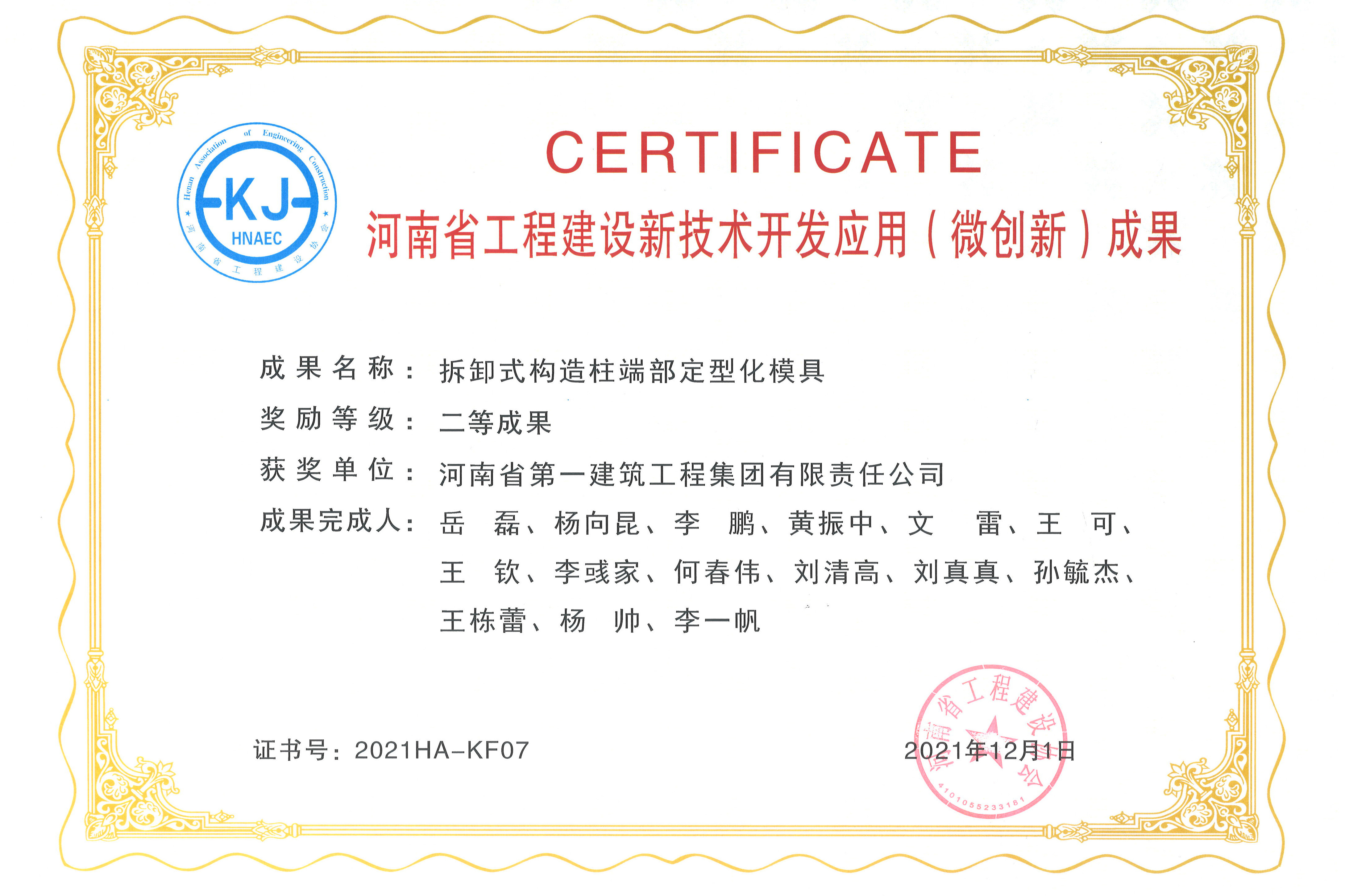 第六项目经理部申报的“具有可拆卸式复合端部的构造柱”获实用新型专利;“拆卸式构造柱端部定型化模具”获河南省工程建设新技术开发应用(微创新)二等成果奖。(安琪)