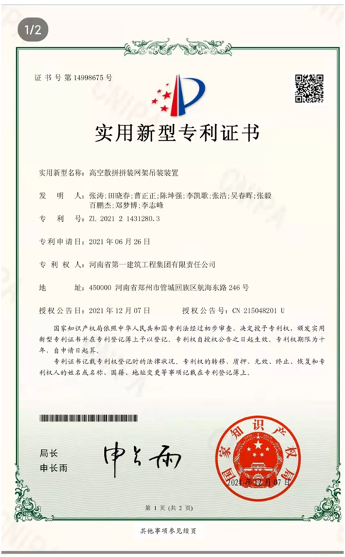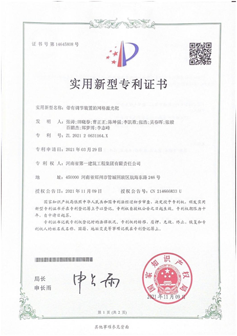 第二十项目经理部申报的“带有调节装置的网格激光靶”“高空散拼拼装网架吊装装置”获实用新型专利证书。(郑梦博)