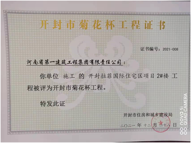 第十四项目经理部承建的开封拉菲国际住宅区项目2#楼 工程被评为开封市“菊花杯”工程。(侯楷)