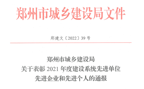 日前,郑州市城乡建设局下发了《郑州市城乡建设局关于表彰2021年度建设系统先进单位先进企业和先进个人的通报》(郑建文〔2022〕39号),集团公司被评为2021年度郑州市建筑业管理先进企业,建设工程质量、安全管理先进施工企业,建设科技工作先进单位;集团公司七公司被评为2021年度郑州市建筑业管理先进企业、集团公司第七项目经理部被评为装配式建筑工作先进单位。(综合)
