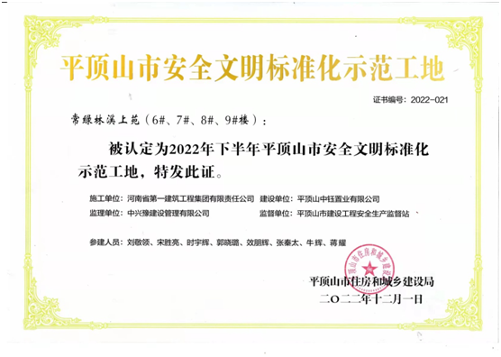 近日,第八项目经理部承建的常绿林溪上苑(6#、7#、8#、9#楼)被认定为2022年下半年平顶山市建筑工程安全文明标准化示范工地。