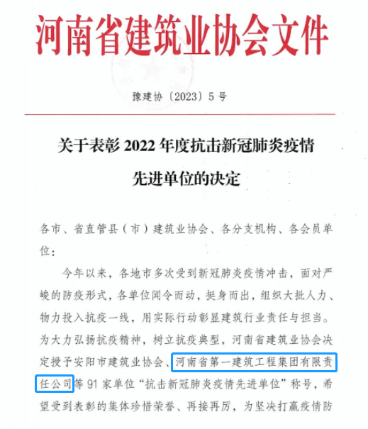 (简讯)集团公司被河南省建筑业协会评为2022年度抗击新冠肺炎疫情先进单位。